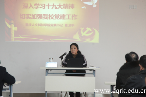 在党的十九大开幕当天,学校组织全校师生集体收看十九大开幕式盛况,学校领导班子集体聆听习近平总书记的报告。10月27日,学校党委召开扩大会议,传达学习党的十九大精神,党委书记张卫平对学习贯彻十九大精神的工作做了全面部署。市委宣讲团成员陈元春,市委教育工委宣讲队成员何向东,以及学校宣讲队成员113人,共开展了十九大精神宣讲400余场,实现了全校师生的全覆盖。此外,学校还通过校园网、校报、微信、微博、广播等媒体广泛宣传,营造了学习宣传贯彻党的十九大精神的良好氛围。