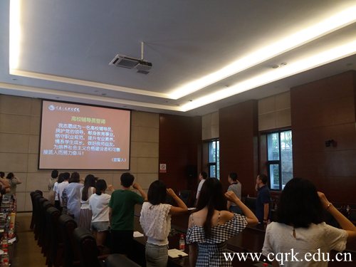 会议第二阶段,进行了新入职辅导员培训开班仪式。朱宇代表学校介绍了培训内容和安排并提出了培训要求。随后,机电与信息工程学院李欢老师代表全体新入职辅导员发言。最后,全体新入职辅导员在仇寒老师的带领下,宣誓成为学生的“青春引路人,人生好导师”。