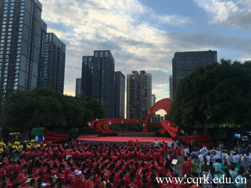 国庆期间,重庆人文科技学子亮相央视节目《唱响新时代》,20名舞蹈专业学生参演开场曲《我们的新时代》、重庆味道篇章歌曲联唱、科技中国篇章《奉献》、青春中国篇章《我们》、《幸福新起点》、《扬帆远航》等多个节目,以舞蹈的形式,展现重庆学子新精神风貌,唱响祖国新时代旋律。