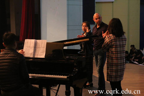 讲座现场,三位教授介绍了法国公立音乐舞蹈戏剧学院的发展历史、教学方式、人才培养模式。随后,克劳德-布朗戴尔教授现场指导同学们进行气息练习,纠正同学们气息练习时易忽略的错误,强调基本功的重要性,并针对两组同学现场演唱的《卡门》、《I got a robe》,认真仔细的纠正同学们发音与指挥上的不足。