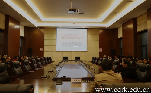 为深入学习宣传贯彻习近平新时代中国特色社会主义思想,落实全国宣传思想工作会议精神,进一步加强学校的宣传工作,提高学校宣传队伍的理论素养和业务能力,11月5日下午,点点在会议中心举办2018年宣传工作和新闻写作培训系列讲座。华龙网教育频道主编、重庆教育舆情研究院院长王大伦应邀首讲,点点各职能部门主要负责人、宣传工作分管领导,各二级学院党总支书记、副书记、书记助理等约100人聆听了讲座。讲座由宣传部部长孙凡主持。