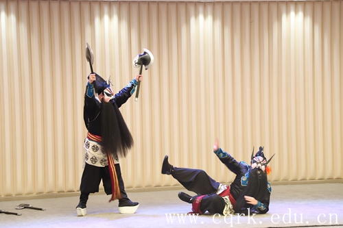 为了让同学们更加直观、深刻地感受国粹艺术魅力,重庆京剧团特别在讲座中穿插了传统京剧折子戏《拾玉镯》《真假李逵》《盗库银》演出,《拾玉镯》孙玉姣的活泼伶俐,《真假李逵》李逵李鬼一正一邪的较量,《盗库银》帅气的短打武旦,通过对花旦、花脸、武旦等不同风格人物的精彩演绎,将京剧的魅力尽展,剧情跌宕起伏,表演美轮美奂,赢得了满堂喝彩。同时重庆京剧团的青年优秀演员、重庆市舞台艺术之星获得者田琳老师还邀请观众上台互动,现场教学京剧“喜、怒、哀、乐”情绪表达演绎,同学们直呼过瘾。师生纷纷表示,通过零距离感受戏曲的魅力,增进了对传统文化的了解,感受到了戏曲文化的博大精深。