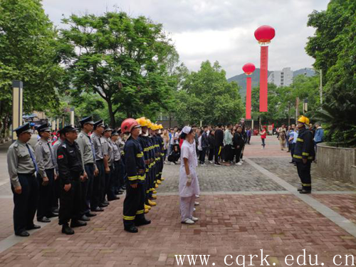 16时35分,演练正式开始,演练模拟两名“犯罪分子”在学校食堂实施纵火,瞬间火光冲天,烟雾弥漫。食堂员工立即拨打火警电话报警,同时工作人员向同学们发出紧急撤离的指示,随后在安全引导员的带领下,400余名师生用湿毛巾或浸湿的衣物捂住口鼻,弯腰低身,有序快速地撤离火灾现场到安全区域。同时,学校在接到火警报警后立即启动反恐、火灾应急预案,学校保卫处保安大队即刻赶往现场实施警戒封锁现场、搭建救灾点、制服了两名纵火“犯罪分子”并搜救转移伤员。与此同时校消防队、合川消防支队赶来控制火情并迅速扑灭火灾,校医院赶到后立即紧急施救并将重伤员即刻送往医院救治。安全引导员在仔细检查完各楼层人员全部疏散后撤离事发现场并宣布人员疏散结束。整个过程历时30分钟左右,一气呵成,精彩的表现得到现场观摩师生的热烈的掌声。