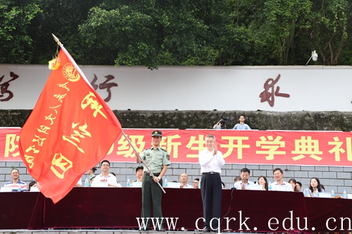 校长、军训领导小组组长张跃光为军训团授旗。