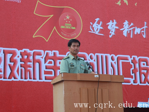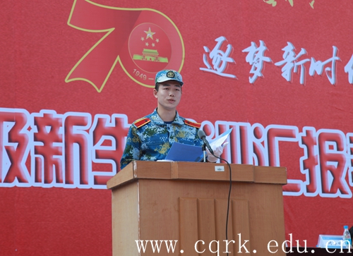一营十一连卢少康同学代表军训新生发言,他感谢军训期间学校领导和老师的热情关怀、教官们的辛苦付出,他认为军训让自己和同学们学会了坚强,知道了使命,懂得了团结,拥有了自信,学会了笑对困难,砥砺前行。