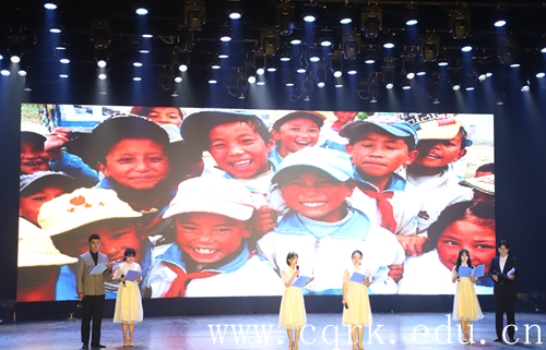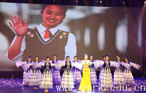 晚会的开场方式别出心裁,伴随着一曲《爱我中华》,20多个少数民族学生代表身着少数民族服装从音乐厅后方载歌载舞来到音乐厅两边过道,来到舞台中央,整个音乐厅瞬间沸腾起来,一群可爱的民族姑娘小伙们为台下的嘉宾领导献上了祝福的哈达,晚会正式开幕。