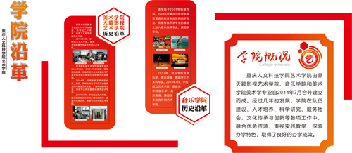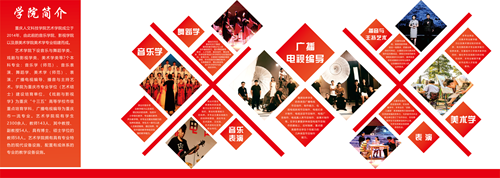 学院确定了以红黄系为主色调的视觉传达体系,旨在展示艺术学院师生的热情与活力,通过巧妙构思,将学院三大专业方向的特色在院徽上融为一体。根据设计构思,在学院两座主体教学楼(广艺楼、八音楼)开辟学院沿革、学院概况、办学思路及目标、办学特色等板块,配以图文集中展示艺术学院成立五年多来在学科建设、专业发展、艺术实践等方面的成果。彰显学院特色,营造“有精神、有内涵、有特色”的育人环境。