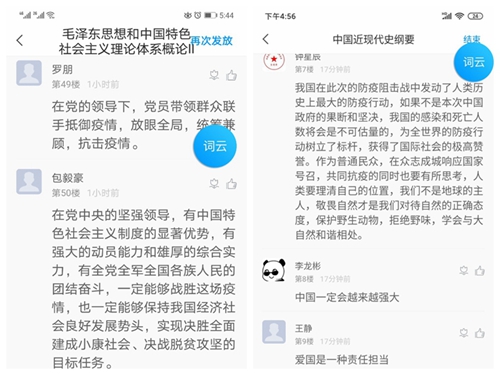 马克思主义学院思政课教师在直播或回放学习以及后期教学内容中结合本学期开设的“马克思主义基本原理概论”、“毛泽东思想和中国特色社会主义理论体系概论”、“中国近现代史纲要”、“形势与政内容四门课程,解读党中央关于疫情防控的决策部署,分析中国抗疫彰显的中国共产党领导和中国特色社会主义制度的显著优势。教师们在直播结束后与学生在超星学习通平台上进行在线讨论,学生们结合后期所开设课程的教学内容写心得体会,并作为期中作业计入过程性考核,确保学生学习更深入。其中全校大一、大二学生结合本学期开设的“马克思主义基本原理概论”、“毛泽东思想和中国特色社会主义理论体系概论”、“中国近现代史纲要”3门必修课教学内容;大三、大四学生结合本学期开设的“形势与政策”中的相关专题。