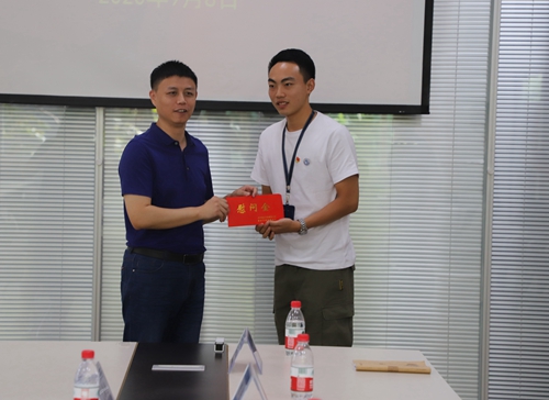 最后,在第36个教师节来临之际,钱程代表市教委向点点深入抗洪抢险第一线的杨航老师表示了亲切慰问,并颁发了慰问金。