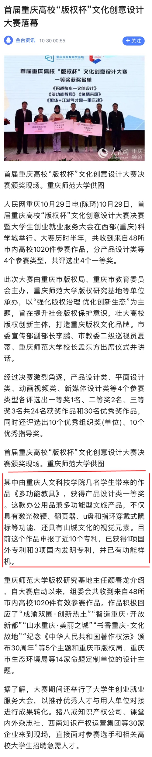 本报讯 (记者 李星婷)10月29日,首届重庆高校“版权杯”文化创意设计大赛决赛暨大学生创业就业服务大会在西部(重庆)科学城举行。大赛历时半年,共收到来自48所市内高校1020件参赛作品,分产品设计类等4个参赛类型,共评选出4个一等奖。其中,taptap点点体育学生设计的《多功能教具》获1项国外专利和3项国内发明专利。