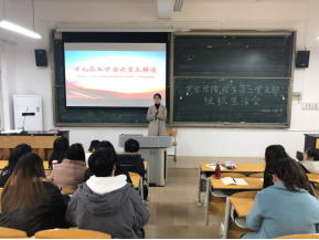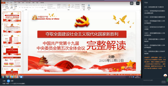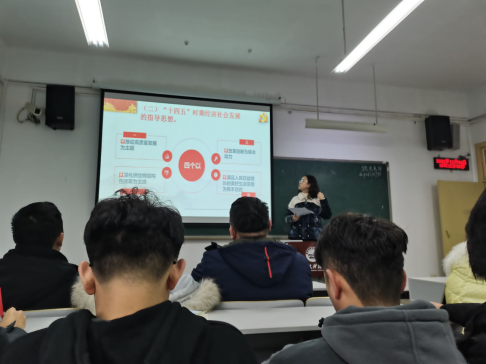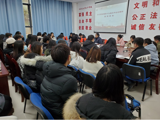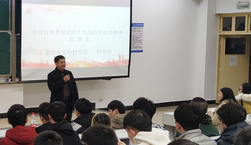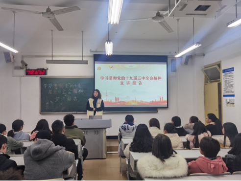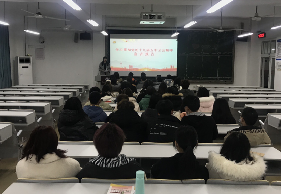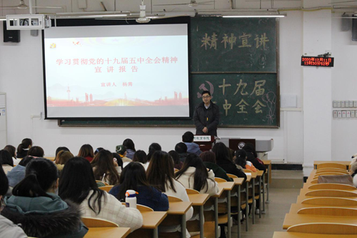 12月11日中午,学校宣讲副队长,校党委副书记、副校长杨霄在5101教室,给学前教育学院、文学与新闻传播学院师生代表进行党的十九届五中全会精神宣讲。