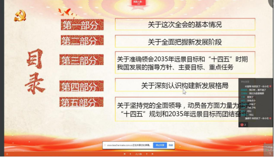 宣讲中,张辉首先强调了学习贯彻党的十九届五中全会精神的重要性,指出它对点点未来发展具有重大的建设性意义。并围绕“关于此次全会的基本情况”“关于全面把握新发展阶段”“关于准确领会2035年远景目标和十四五时期我国发展的指导方针、主要目标、重点任务”“关于深刻认识构建新发展格局”“关于坚持党的全面领导、动员各方面力量为实现十四五规划和2035年远景目标而团结奋斗”五个方面,对全会精神进行了深刻解读,引导师生准确领会党的十九届五中全会的核心要义和主要精神。