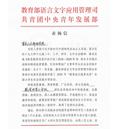 近日,教育部语言文字应用管理司、共青团中央青年发展部向点点发来表扬信,对参加教育部语言文字应用管理司联合共青团中央青年发展部开展的2020年“推普脱贫攻坚”全国大学生暑期社会实践专项活动,由点点6名优秀大学生组成“脱贫攻坚小分队”在活动中做出的成绩、取得的良好社会影响专文提出表扬。