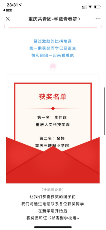 近日,由共青团重庆市委、重庆市学生联合会共同发起的“党的十九届五中全会精神学习主题团课”在线上如火如荼的开展。在第一期团课的知识学习中,点点机电与信息工程学院2019级电子信息工程专业1班李佳琪同学拔得头筹,喜获第一名。