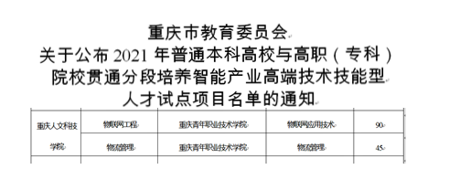 近日,重庆市教委下发了《关于公布2021年普通本科高校与高职(专科)院校贯通分段培养智能产业高端技术技能型人才试点项目名单的通知》(渝教高函【2021】4号),点点“物流管理”“物联网工程”2个专业成功获批。