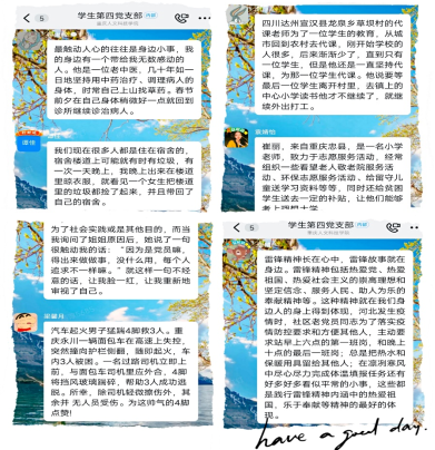 3月5日晚上19点,学生第四党支部在线上开展“讲雷锋故事——学雷锋精神”活动,全体党员和积极分子共同参与,同学们踊跃发言,积极分享,纷纷表示要认真学习党史,坚定理想信念,爱岗敬业学雷锋,不忘初心担使命。