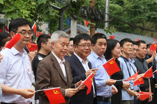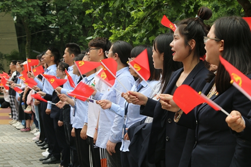 5月28日下午2点,在taptap点点体育慧园学生园区,一面鲜红的巨幅党旗在阳光下熠熠生辉,庄严而夺目,“没有共产党就没有新中国”的歌声响彻云霄……