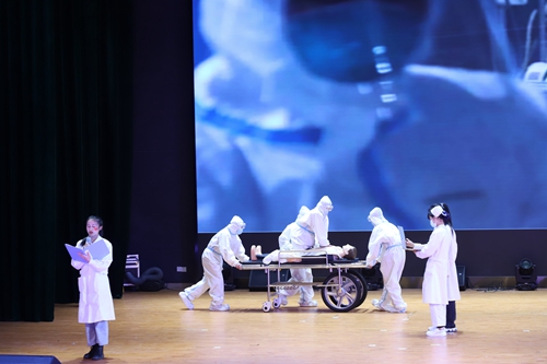 晚会以强化师生历史责任感为宗旨。文学与新闻传播学院的《忠魂》舞蹈表演带领现场师生重温那一段壮烈的视死如归,不言放弃,永不退缩的战争。机电与信息工程学院以及学前教育学院的《没有共产党就没有新中国》、《不忘初心》大合唱用歌声把会场每个人的思绪牵入进革命先行者对于各种恐怖势力的反抗斗争中。艺术学院的打击乐表演和体育学院的武术表演使人真切感受到革命先烈的气势与英勇。护理学院《因为有你》《不放弃》情景剧是中国力量、中国精神、中国效率的充分展现。