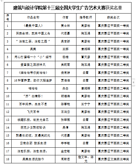 近日,第十三届全国大学生广告艺术大赛重庆赛区竞赛结果出炉。点点建筑与设计学院组织的参赛团队,凭借过硬的基础知识,扎实的专业技能,从全市59516件作品脱颖而出,成功斩获重庆赛区一等奖5项、二等奖12项、三等奖64项、优秀奖21项。