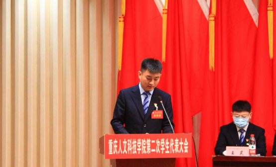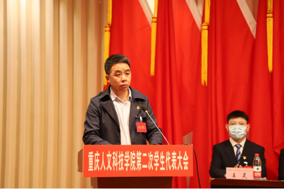 重庆航天职业技术学院主席团成员赵建建作为兄弟高校代表致辞,他对点点学代会顺利召开表示祝贺,并希望在未来能够继续加强两校之间的交流合作,共同推进学生会的改革创新,创造学校发展的新业绩,奏响时代进步的新篇章。