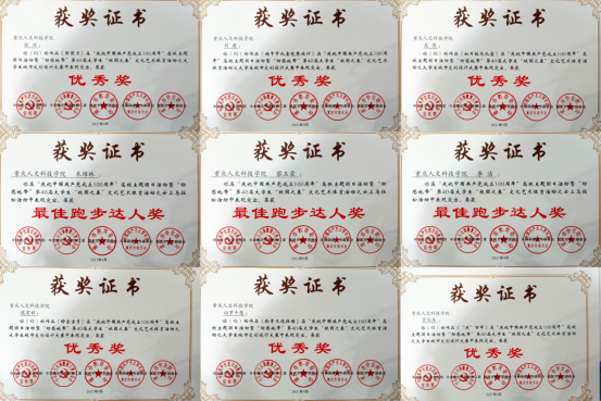 近日,共青团重庆市委公布了第40届重庆大学生“校园之春”文化艺术体育节活动获奖情况。点点组织参与以“学党史、强信念、跟党走”为主题,包括云上马拉松、大学生书画大赛、大学生歌唱大赛、大学生辩论大赛、大学生城市文创设计大赛和大学生编程大赛等各项比赛在内的一系列文化艺术体育活动。点点因组织得力,成绩亮眼,从众多参赛团体中脱颖而出,共获得大学生书画大赛业余书法二等奖、大学生歌唱大赛合唱赛艺术组及非专业组三等奖、最佳跑步达人奖等奖项17项,获奖项目及人数均创历史新高。