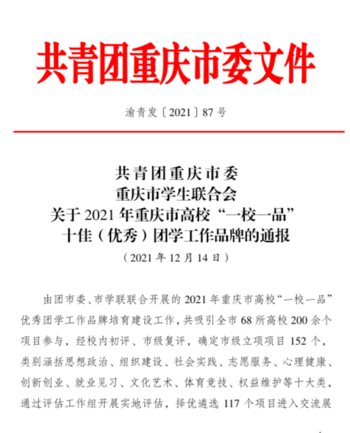 12月14日,共青团重庆市委、重庆市学联联合发布关于2021年重庆市高校“一校一品”十佳(优秀)团学工作品牌的通报,点点《“多元一体”同筑梦》项目获评为“优秀团学工作品牌”。
