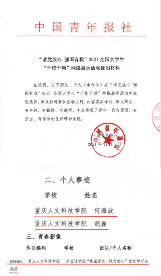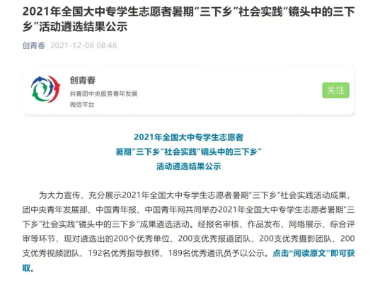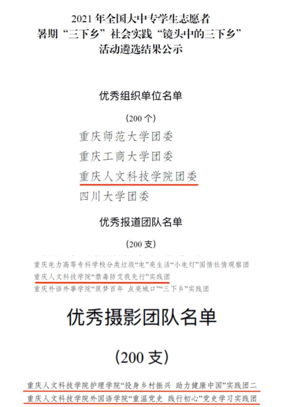 近日,由共青团中央青年发展部、中国青年报共同举办的2021年全国大中专学生志愿者暑期“三下乡”社会实践“镜头中的三下乡”成果遴选活动评选结果揭晓,在此次活动中,学校团委荣获“优秀组织单位”荣誉称号,“投身乡村振兴 助力健康中国”实践团、“重温党史 践行初心”党史学习实践团获“优秀摄影团队”荣誉称号, “禁毒防艾我先行”实践团获“优秀报道团队”荣誉称号。在“请党放心 强国有我”2021全国大学生“千校千项”网络展示活动中,点点“重温党史,践行初心”党史学习实践团以及外国语学院胡鑫同学、机电学院何海波同学分别获集体与个人奖项。
