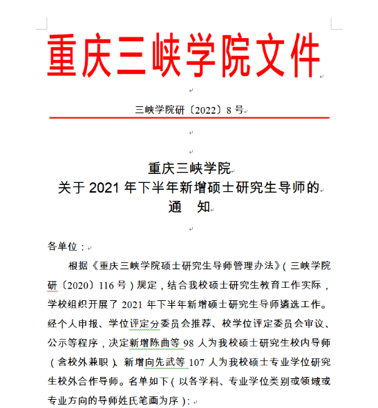 近日,根据《重庆三峡学院关于2021年下半年新增硕士研究生导师的通知》(三峡学院研〔2022〕8号),点点邓旭升、禹华平、吴强、薛海波、谷伟平、邓凌云、龙文展、杨芬、董晨峰、范瑞利等10名教师增列为重庆三峡学院硕士研究生校外兼职导师。