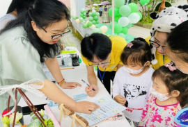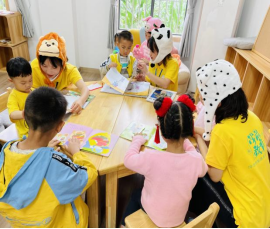在以亲子为主题的儿童绘本馆,小朋友们化身为小兔子,聆听小老师们讲述《猜猜我有多爱你》等绘本故事,学会用多种方式去感受、表达和回应父母的爱。最后,大家还把故事中的人物角色制作或绘画出来,表示对父母的感激。