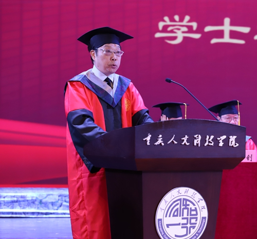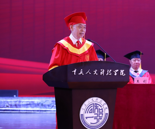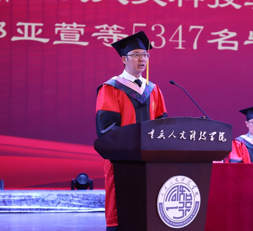 身穿红色校长袍的学校学位评定委员会主席、校长张跃光代表学校董事会、学校党政及全体师生员工,向顺利完成学业的5300余名毕业生表示衷心祝贺,向全体教职员工表达诚挚敬意,向陪同全体毕业生一路前行的家长和一直关心支持学校发展的各界人士表示感谢。他在讲话中与全体毕业生共同回味了学校的唯美、写意、哲理与青春。他表示,在重人科这片浸透着拓荒者与建设者心血与汗水、梦想与希望的土地上,因为大家曾经怀抱的青春与梦想,刻上了四道深深的年轮,所有的同窗谊、师生情,都将收进相册,装进行囊,随学子们奔赴远方。他用自己近70载的阅历智慧送上了对全体毕业生的深情嘱托:第一,做个俗人,学会真实生活;第二,做个哲人,拥有处世智慧;第三,做个超人,踏寻人生境界。最后,他希望同学们发出“请党放心,强国有我”的最强音,祝愿全体同学事业有成、家庭幸福、爱情甜蜜、如意吉祥!