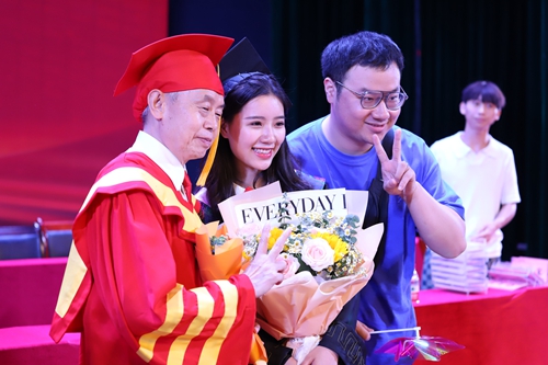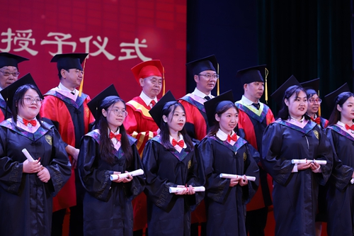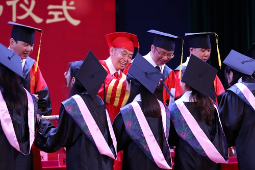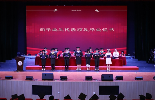 毕业生代表依次登台,由学位评定委员会全体成员颁发证书,拨正帽穗。全体学子手捧证书,满脸微笑,洋溢着辛苦付出后收获成果的满足与幸福。