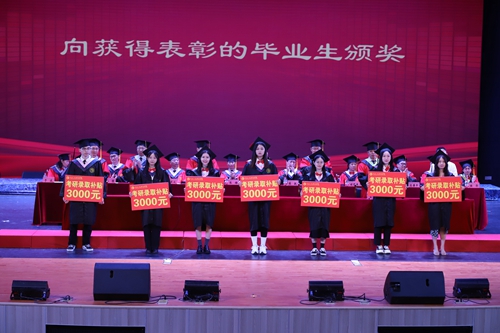 受到表彰的学生代表登台领奖,考取研究生的同学人人获颁3000元奖金。