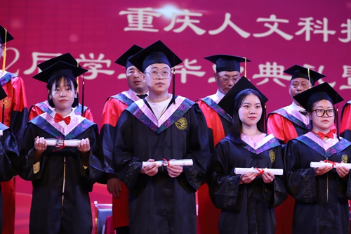 现场全体毕业生起立,举起右拳,共同向母校庄严宣誓:“传承人科精神,发扬人科校训。不负师生教诲,母校培养;不负父母期望,国家期许;不忘初心,勇挑重担;不惧风雨,勇往直前。无论天涯海角,山高水长;无论从业创业,故乡他乡。立报国之志,践报国之行。让青春在党和人民最需要的地方绽放!”
