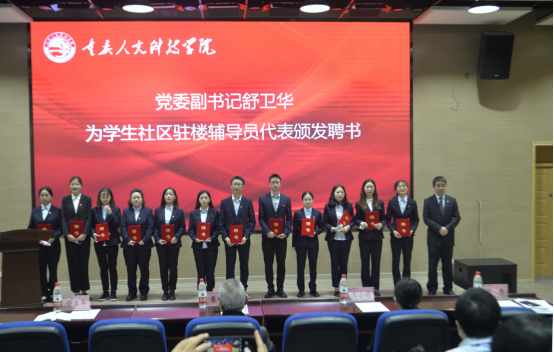 随后校长助理吴静宣读了2022-2023学年学生社区驻楼辅导员、学业导师名单,张跃光、舒卫华分别为2022-2023学年学生社区学业导师代表、驻楼辅导员颁发聘书。