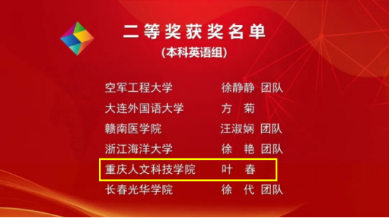 据了解,该交流活动前身是“中国外语微课大赛”,于2014年由高等教育出版社和中国高等教育学会率先发起,旨在加快外语教育信息化发展,促进疫情常态化线上线下教学的深度融合。今年共有来自30个省、市526所院校1210件作品参与,分为本科英语组和高职高专英语组两个组别,点点外国语学院教师叶春在初赛中一举夺魁,获得重庆赛区比赛特等奖,作为重庆赛区唯一参加全国总决赛的代表并作线上交流。