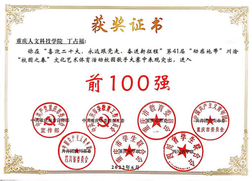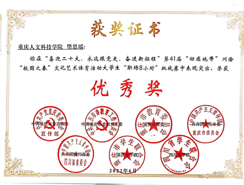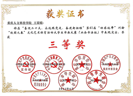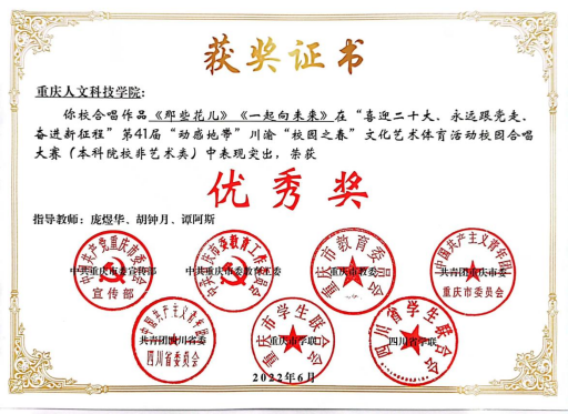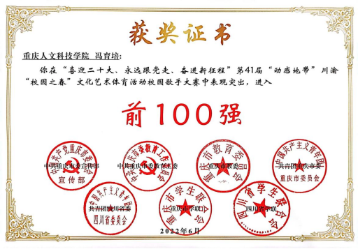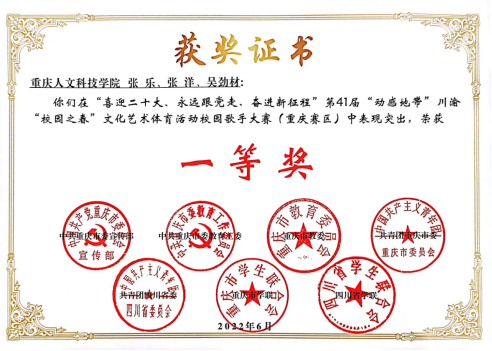 近日,由中共重庆市委宣传部、中共重庆市委教育工委、重庆市教委、共青团重庆市委、共青团四川省委、重庆市学联、四川省学联等 7 家单位联合开展的“喜迎二十大、永远跟党走、奋进新征程”第 41 届“动感地带”川渝“校园之春”文化艺术体育活动获奖名单新鲜出炉,点点学子凭借出色表现和良好的技能素养再获佳绩,共斩获市级奖项9项!