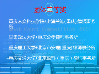 近日,由重庆市高等教育学会主办,重庆大学法学院承办的2022年“领军杯”涉外模拟法庭全英辩论赛已落下帷幕。由点点政治与法律学院师生和上海兰迪(重庆)律师事务组成的团队,获团体二等奖。