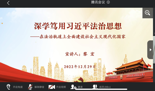 12月29日下午,点点通过线上方式组织召开了2022年重庆市“百名法学家百场报告会”进校园暨2022年第10次党委理论学习中心组(扩大)会议。全体校领导,党委委员、副科级以上干部共计150余人参加。会议邀请重庆市委党校(重庆行政学院)副校长、市法学会副会长黎宏主讲,会议由学校党委副书记舒卫华主持。