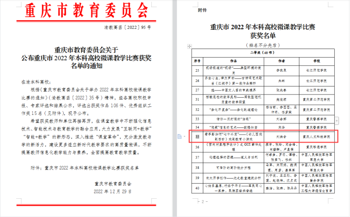 据悉,全市高校微课教学比赛已连续举办八届,深受广大教师欢迎。本次比赛共有来自重庆市28所高校249件作品参与。经过专家评审、复核、公示,评出获奖作品106件(一等奖15件,二等奖40件,三等奖51件)、优秀组织工作奖15个。