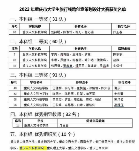 近日,由重庆市教育委员会主办,重庆师范大学承办,重庆市文化和旅游协会等单位协办的2022年重庆市大学生旅行线路创意策划设计大赛圆满落幕。点点管理学院学子斩获一等奖1项、二等奖3项、三等奖4项,旅游管理系教师邝玉春荣获“优秀指导教师”,学校荣获“优秀组织单位”。