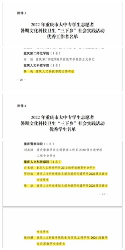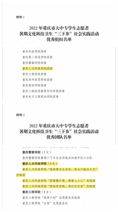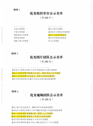 在2022年重庆市大中专学生志愿暑期文化科技卫生“三下乡”社会实践活动中,学校团委获评“优秀组织”,“青春聚力正当时,恒合乡振兴之光”实践团、“国情携乡情,情情人人心”实践团、“敦品促实践,笃行兴石鱼”实践团获评“优秀团队”,团委书记韩亮获评“优秀工作者”,2019级学前教育专业学生白玉娇、2020级汉语言专业学生罗诗韵、2020级汉语言专业学生张柒、2020级数学与应用数学专业学生张诗麒获评“优秀学生”。