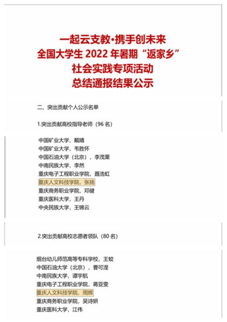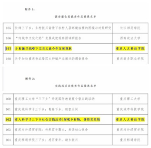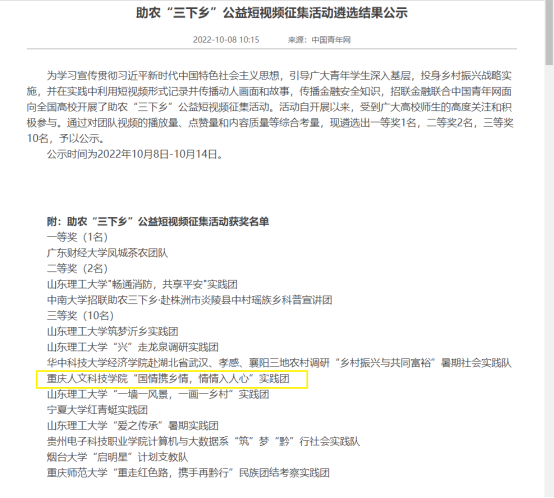 由中国大学生在线举办的“大我青春”2022暑期社会实践成果征集展示活动推选中,点点团队作品《乡村振兴战略下忠县文旅合作发展现状》获得调查报告类优秀作品,《重人科学子三下乡社会实践活动|细观乡村物,体悟党恩情》获实践风采类优秀作品。