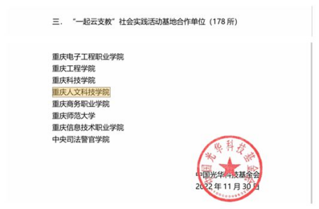 由团中央青年发展部指导,中国光华科技基金会主办的“一起云支教·携手创未来”全国大学生2022年暑期“返家乡”社会实践专项活动中,学校获“一起云支教”社会实践活动基地合作单位,张扬同志荣获“突出贡献高校指导教师”,周辉同学获“突出贡献高校志愿者领队”。