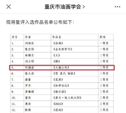近日,重庆市油画学会公布了“话语生产与视觉智慧“——2022第三届重庆油画双年展评选结果,点点艺术学院教师何涵虚作品《大渝山色》荣获二等奖。