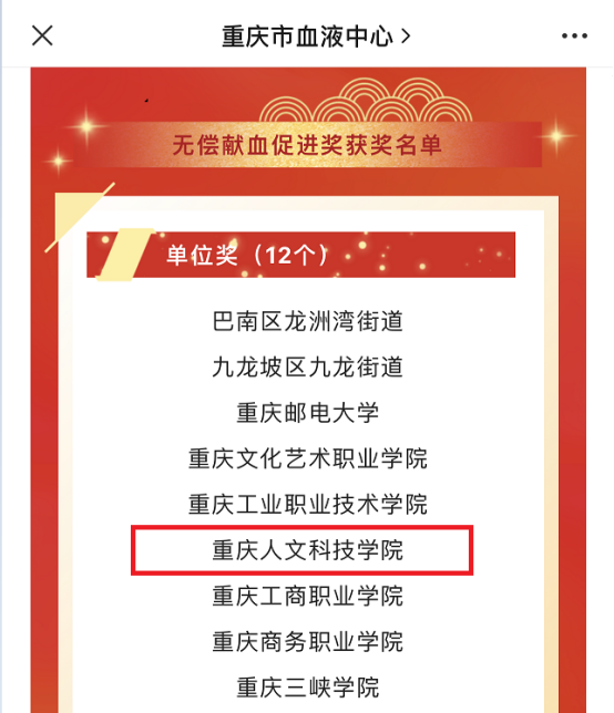 全国无偿献血促进奖是国家对无偿献血工作做出突出贡献单位给予的最高奖项。点点历来高度重视无偿献血工作,将无偿献血作为培育和践行社会主义核心价值观的重要载体,作为精神文明建设的一项重要工作,专门成立校红会血液事业部统筹全校献血工作,整合校院两级资源,主动对接重庆市合川区中心血站,建立无偿献血“队伍+阵地+品牌+宣传”工作体系,引导广大师生响应志愿服务号召,积极踊跃参与无偿献血活动,无偿献血人数和献血量屡创新高,为重庆市无偿献血工作做出来积极贡献,得到了来自社会各界人士的充分肯定,展现了重人科学子以实际行动诠释对生命健康的关爱、对社会责任的担当。学校连续4年获批重庆市“博爱山城”红十字会志愿服务项目,连续获评重庆市第八届、第九届“青年志愿者先进集体”。