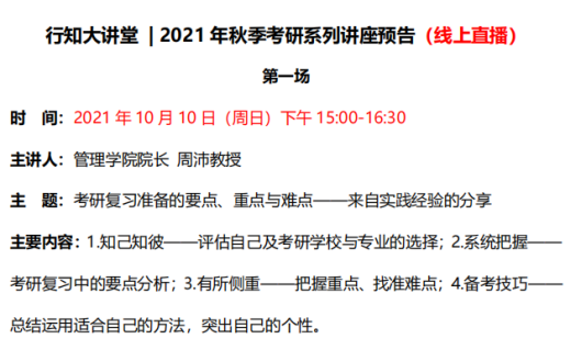 近期,学校科研处和图书馆携手打造“行知大讲堂·考研系列讲座”活动。此项活动旨在进一步帮助全校考研学子明确考研目标、丰富复习经验、掌握复习技巧,提高点点广大考研学子的复习效率。10月10日,由学校管理学院院长周沛教授主讲的“考研复习准备的要点、重点与难点——来自实践经验的分享”,作为系列活动的第一场专题讲座顺利举行。此次讲座借助钉钉平台,以线上直播形式进行,全校680余名同学参与其中。