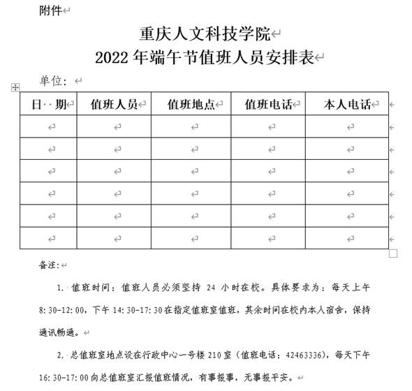 1. 各单位要按照学校《关于印发<休假、值班、加班管理暂行规定(修订)>的通知》(重人科〔2019〕175号)和《关于印发〈值班管理制度(修订)〉的通知》(重人科〔2019〕180号)规定,妥善安排假期的值班工作。学校总值班由党政办公室统一安排,其他单位自行安排值班,并将值班人员安排表(见附件),于5月31日(星期二)16:00前报送党政办公室综合科(行政中心一号楼2-8室)。