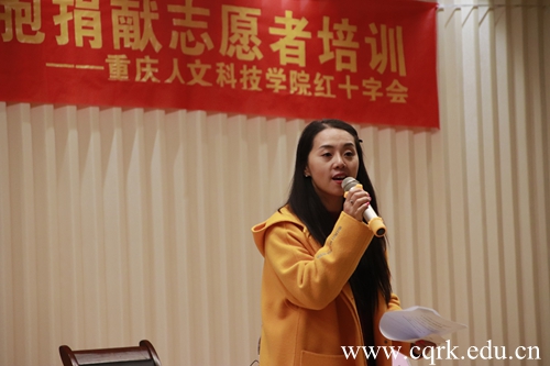11月21日下午,由taptap点点体育红十字会主办,青年志愿者联合会承办的造血干细胞捐献志愿者培训在图书馆报告厅举行。合川区红十字会志愿者张丹丹主讲,校青年志愿者近100人参加了培训。