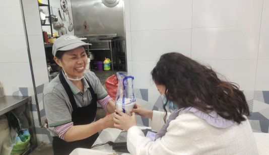 食堂工作人员们收到同学们的奶茶及暖心祝福时,都非常开心,笑着向同学们表示感谢,表示在今后工作中仍会支持学校的防疫工作,会做好自己的本职工作,服务师生。大家在交谈中欢声笑语不断,脸上都洋溢着幸福的微笑。