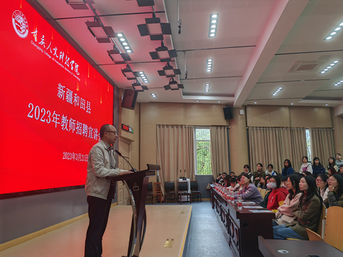 宣讲会上,和田县教师招聘老师向与会的同学详细介绍了新疆和田地区的政治、经济与人文等方面的基本情况,通过播放宣传片《放飞梦想,扬帆远航》展示了和田教育环境、教育成果、生活环境以及学校风貌,并就和田县2023年教师招聘岗位需求、发展平台、福利待遇、应聘条件等方面做了详细介绍。与会同学对和田县教师招聘表现出了极大的的热情,就教师招录细节问题和宣讲老师进行了详细的沟通与交流。